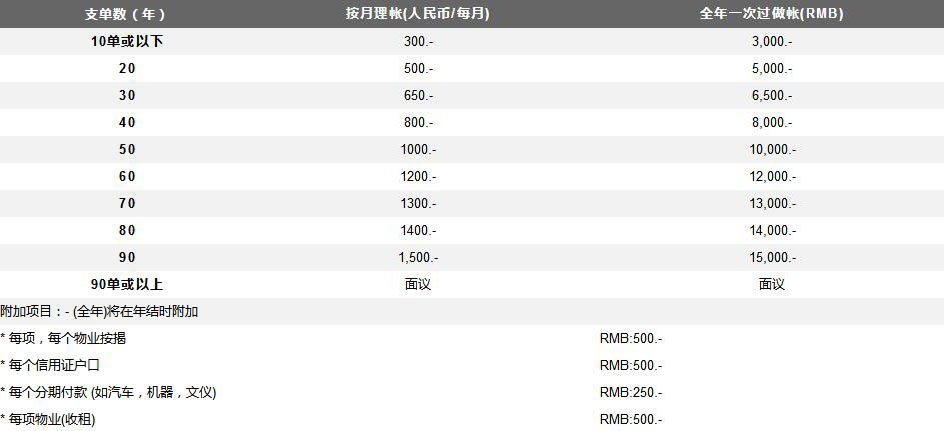 一般,報稅理賬是按照支單數(shù)的多少來收費的,分按月理賬和全年一次理賬收費。請依照下表查看對應(yīng)收費標準: