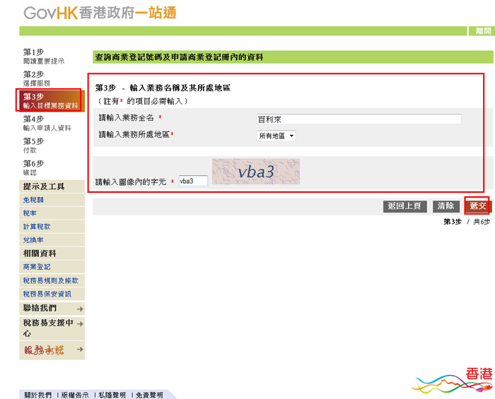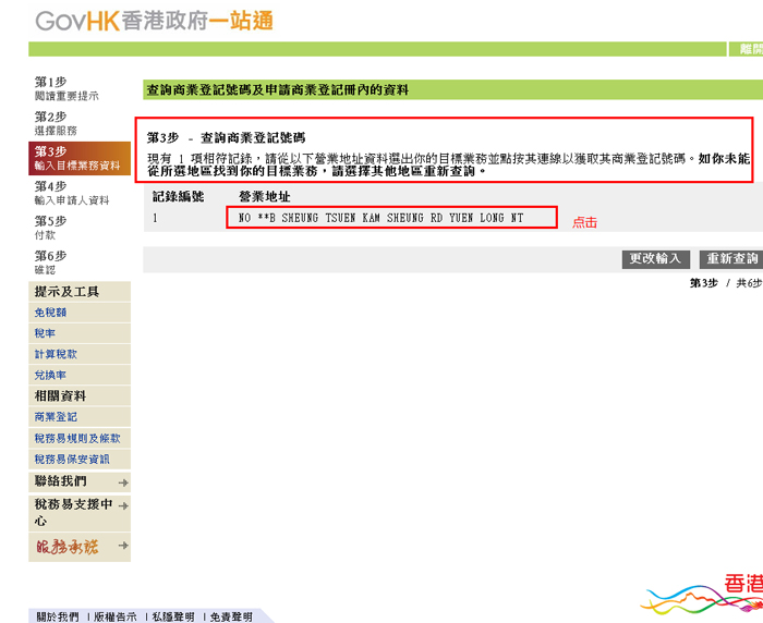 (查詢商業(yè)登記號碼)輸入業(yè)務(wù)名稱及其所處地區(qū)