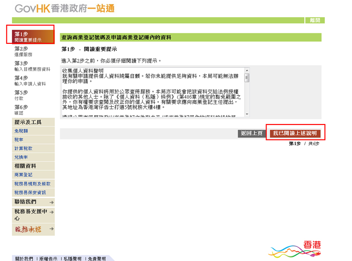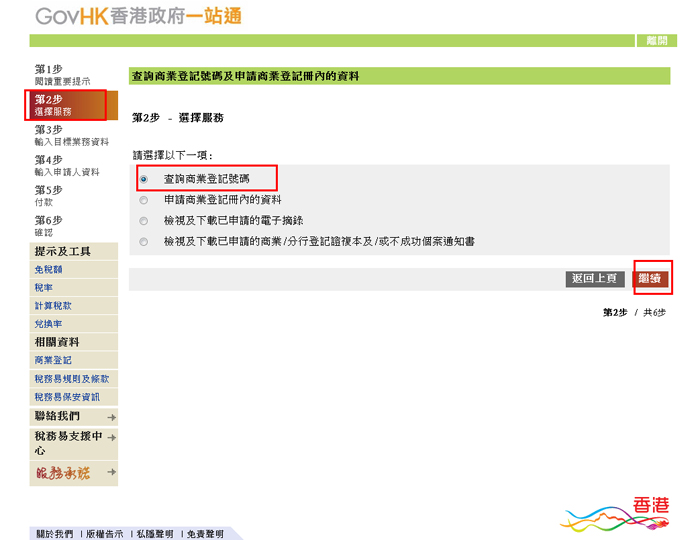 六、進(jìn)入立即申索的頁面后,會出現(xiàn)“查詢商業(yè)登記號碼及申請商業(yè)登記冊內(nèi)的資料”,按照步驟進(jìn)行查詢: