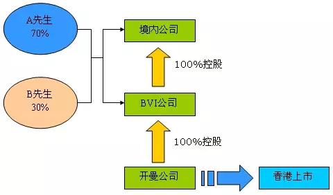 3.接著,對BVI公司增資,再與A先生和B先生進(jìn)行股權(quán)轉(zhuǎn)讓,收購他們擁有的內(nèi)地公司的股權(quán),則內(nèi)地公司變?yōu)锽VI公司的全資子公司。BVI公司在開曼群島或百慕大群島注冊成立一家離岸公司作為日后在香港掛牌上市的公司。