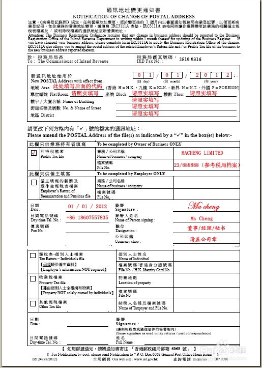 2、填寫稅局的規(guī)范表格稅局提供了規(guī)范性的統(tǒng)一表格,用于受理香港地址變更的通知,表格名為ir1249。下載表格后,將香港名稱、更改的地址詳細(xì)情況、時間填寫進去后,即可完成變更。