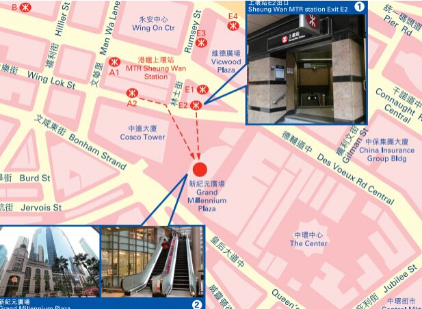 港鐵上環(huán)站E2出口,往左直走至永安百貨,對面即為新紀(jì)元廣場。
