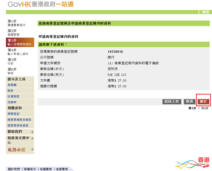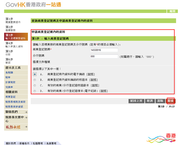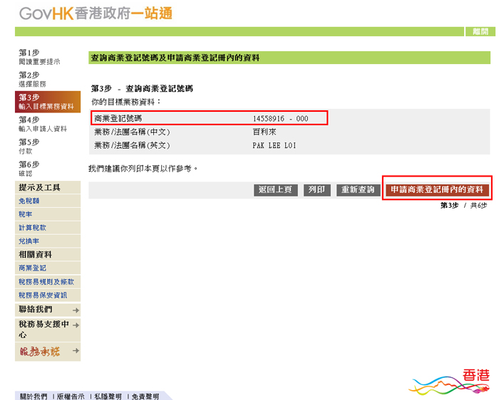 (申請商業(yè)登記冊內(nèi)的資料)輸入商業(yè)登記號碼